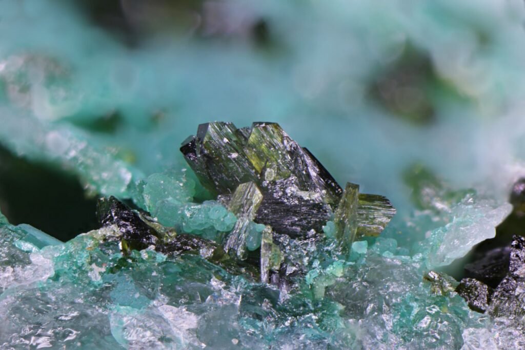 Olivenite, Chrysocolla, Clinoclase, Wheal Gorland, Cornwall August 20, 2025 Pendleton Cornwall Mineral Details Wheal Gorland, St DayOlive-green olivenite with pale blue chrysocolla and clinoclase (not in picture).3808 Olivenite, Chrysocolla, Clinoclase, Wheal Gorland, St. Day, Cornwall, England, UK. Width of view 3.5mm.