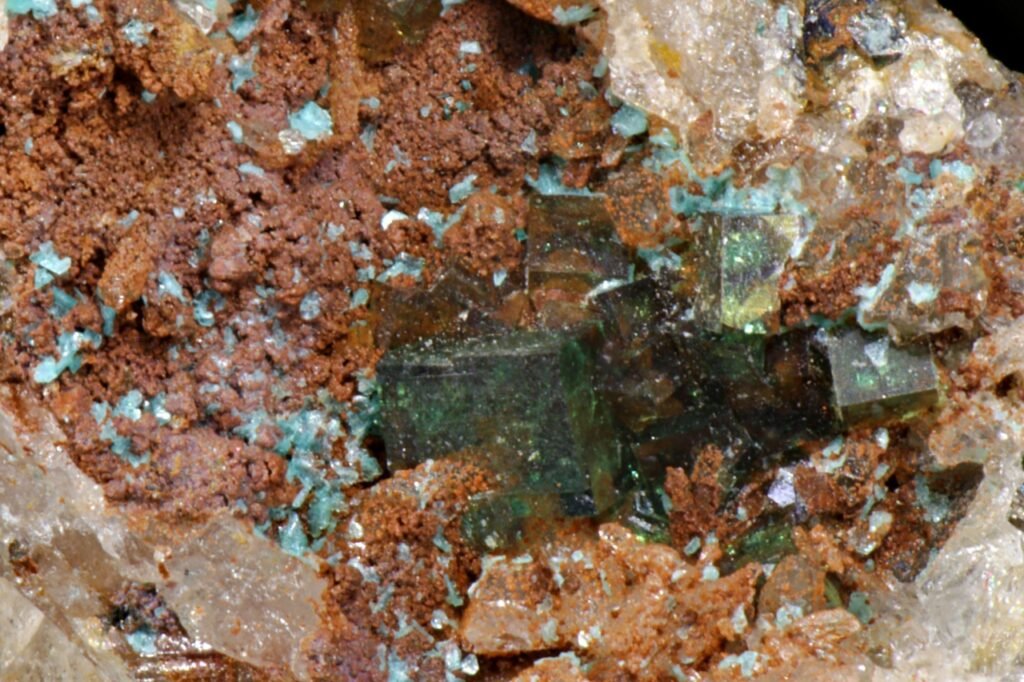 Pharmacosiderite, Chalcophyllite, Wheal Gorland, Cornwall August 20, 2025 Pendleton Cornwall Mineral Details Wheal Gorland, St DayGreen cubes of pharmacosiderite with pale blue platy chalcophyllite.1288 Pharmacosiderite, Chalcophyllite, Wheal Gorland, St Day, Cornwall, England, UK. Width of view 7.5mm.